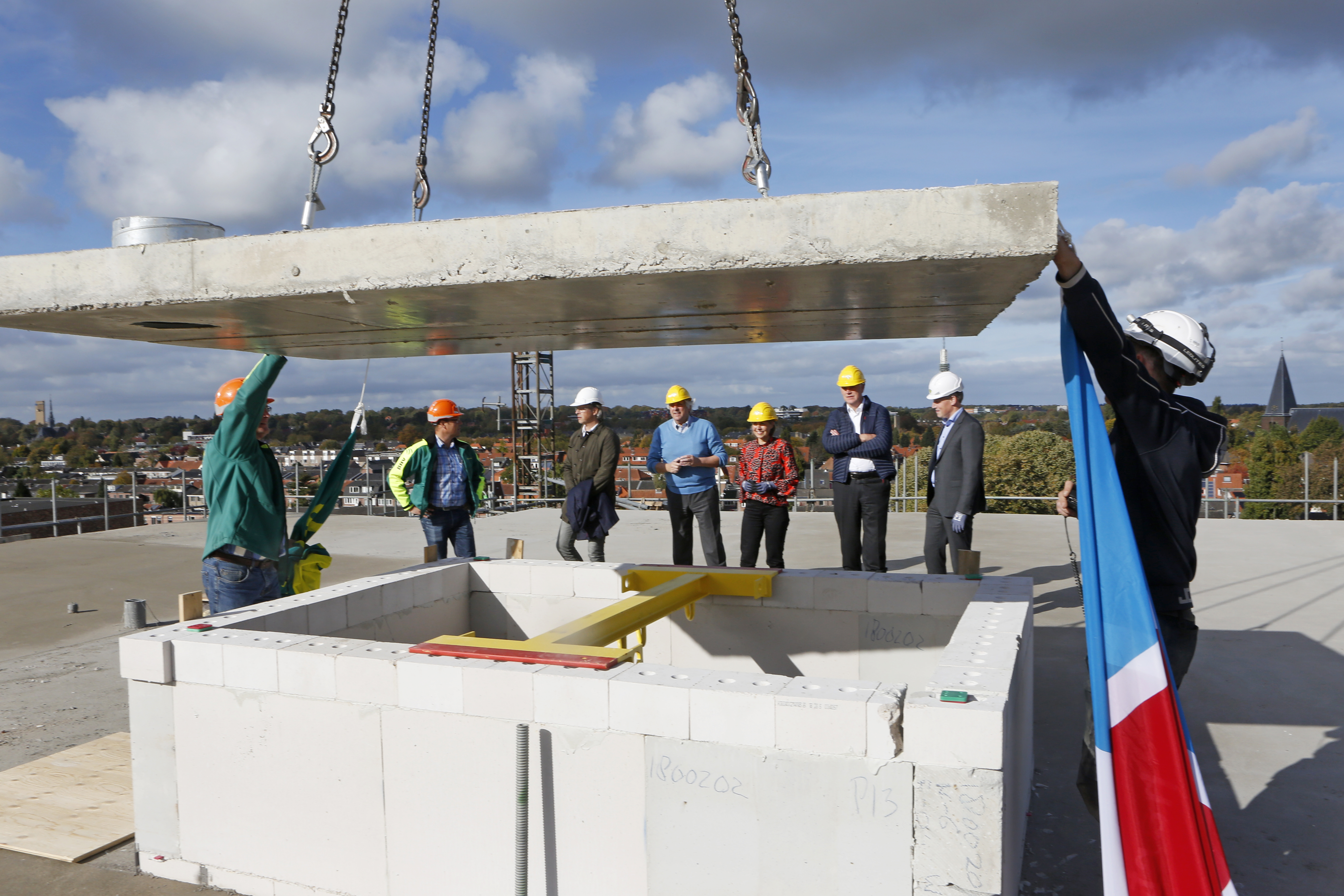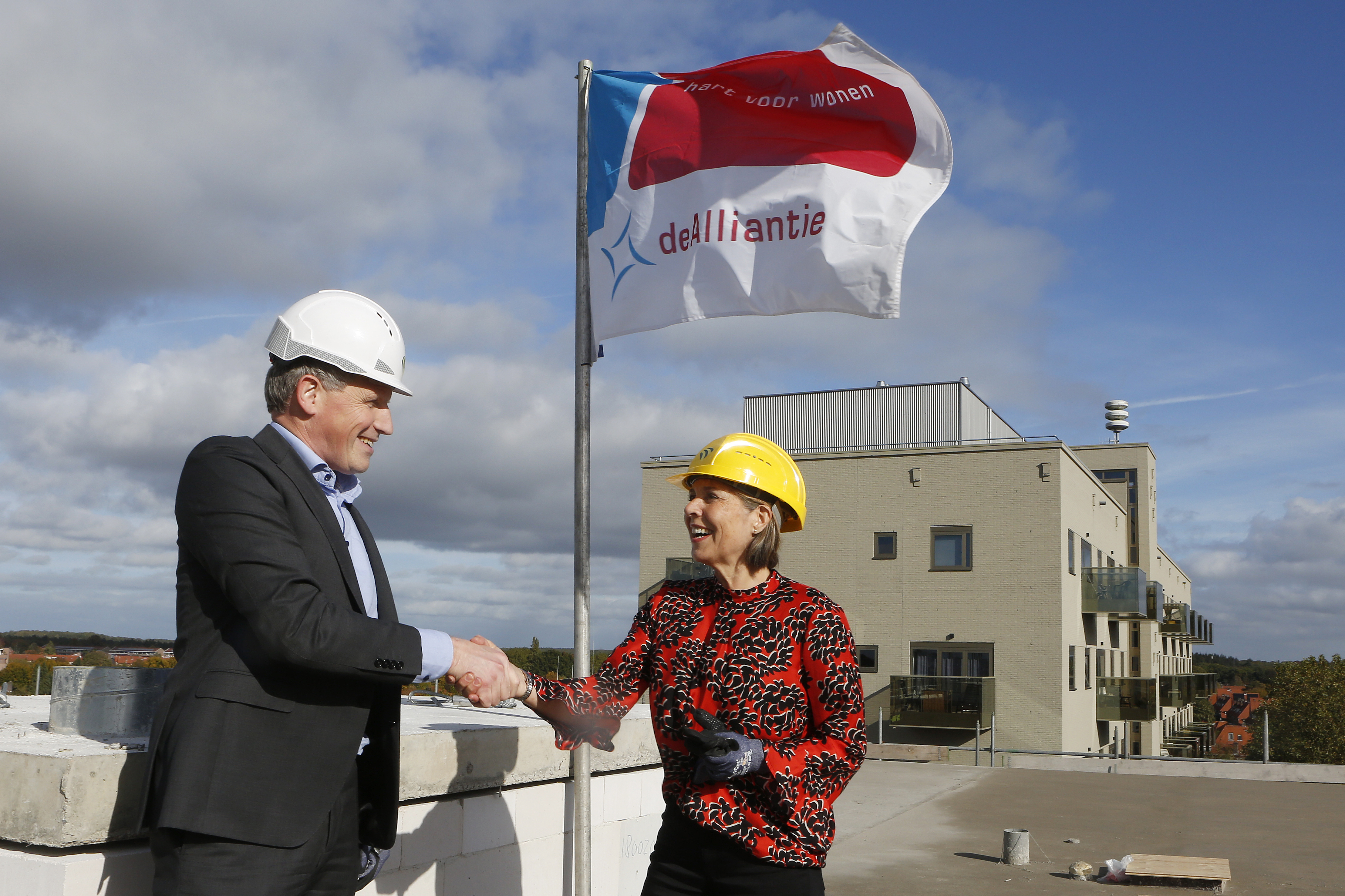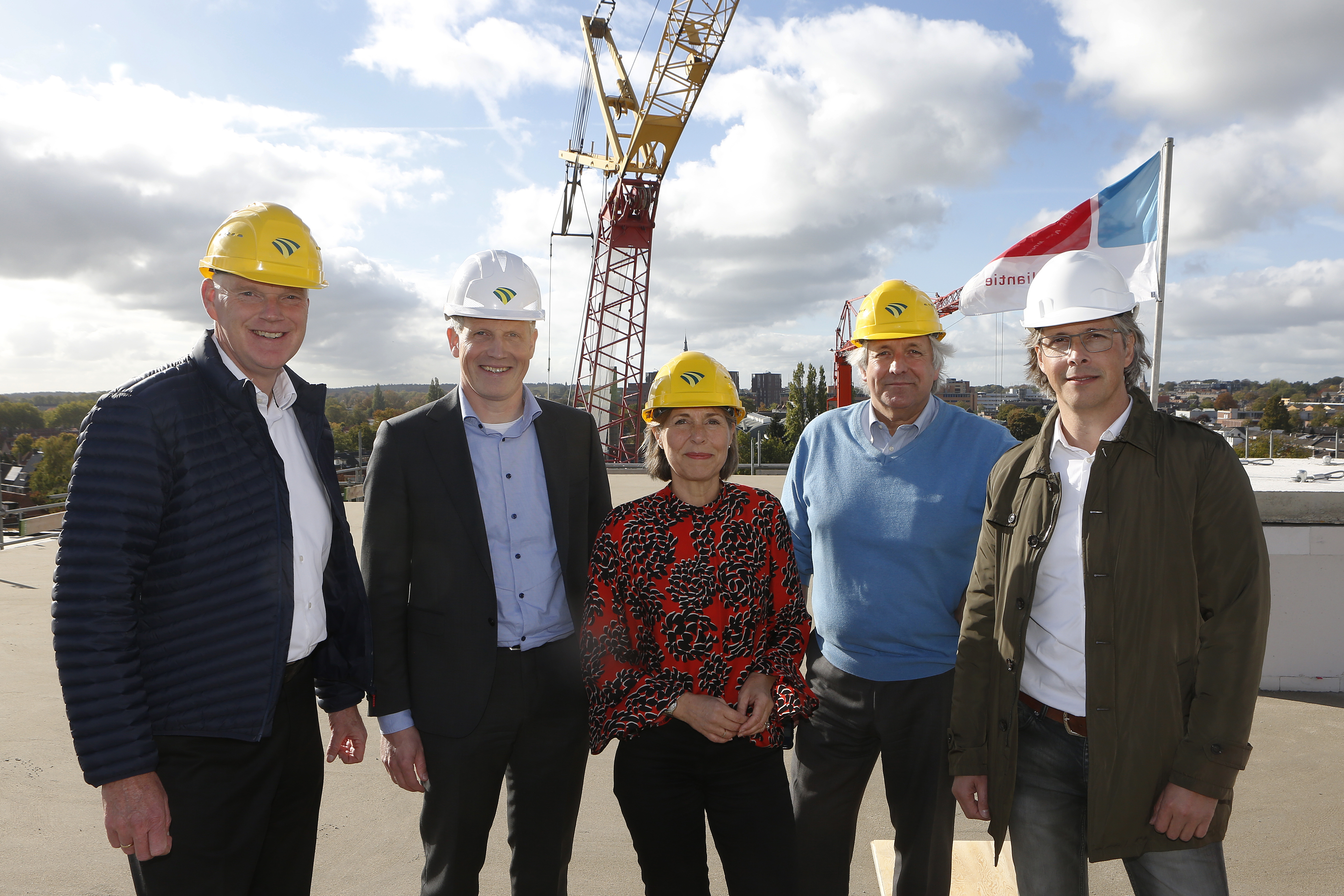 Na de oplevering van het eerste deel van de parkeergarage op 4 oktober hebben wij op 18 oktober het hoogste punt bereikt van de nieuwbouw appartementen op Lucent. Dit hoogste punt is gerealiseerd door middel van het leggen van de dakplaat van de liftopbouw. Dit werd gezamenlijk gedaan door Joan van der Burgt (regiodirecteur de Alliantie Gooi en Vechtstreek) en Koert Terhürne (directeur bouw Dura Vermeer Bouw Hengelo) onder goedkeurend oog van Jan van Barneveld (directeur de Alliantie Ontwikkeling). En natuurlijk onder toeziend oog van een heleboel collega's vanuit het kantoor van de Alliantie.