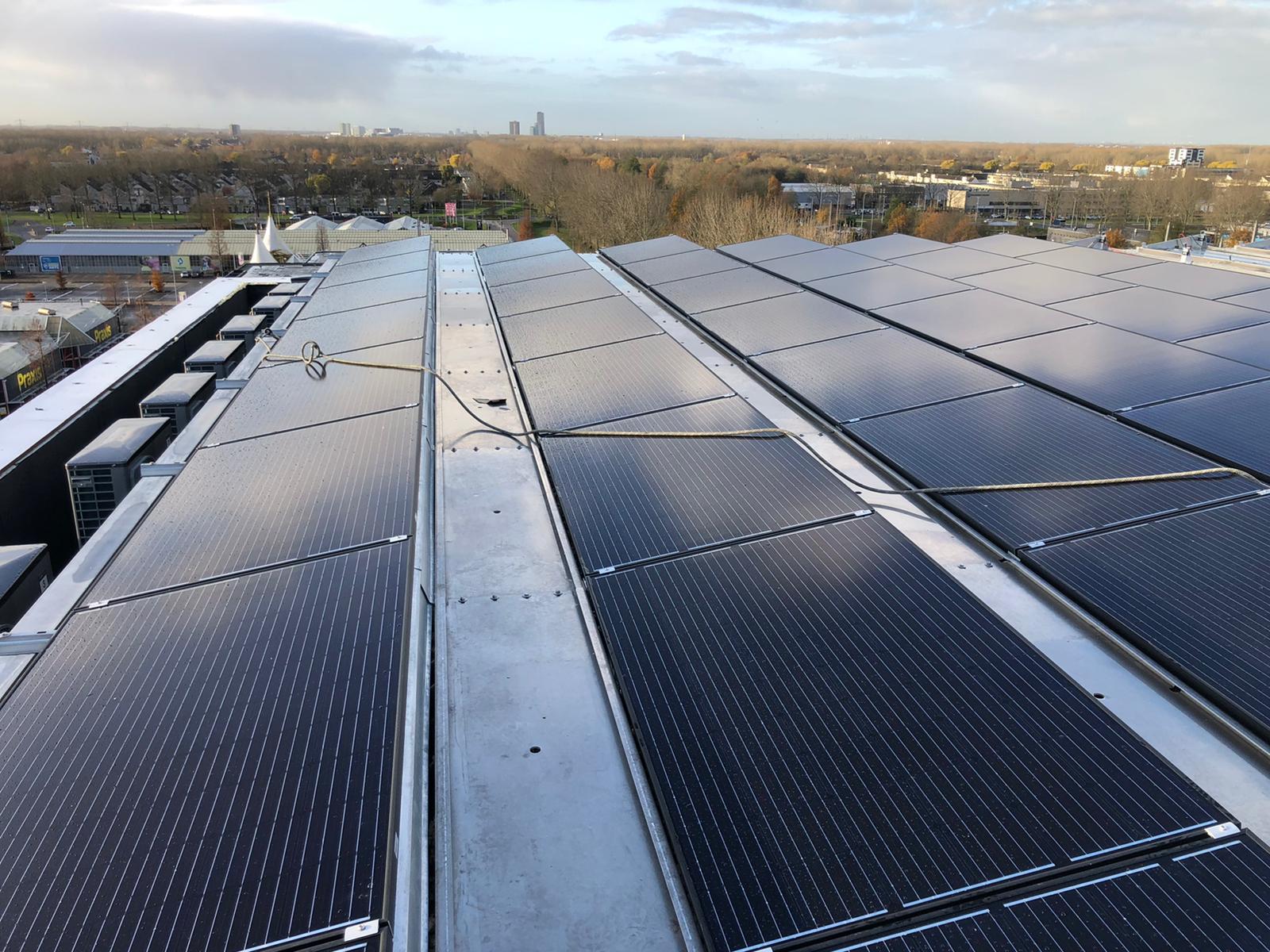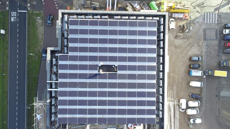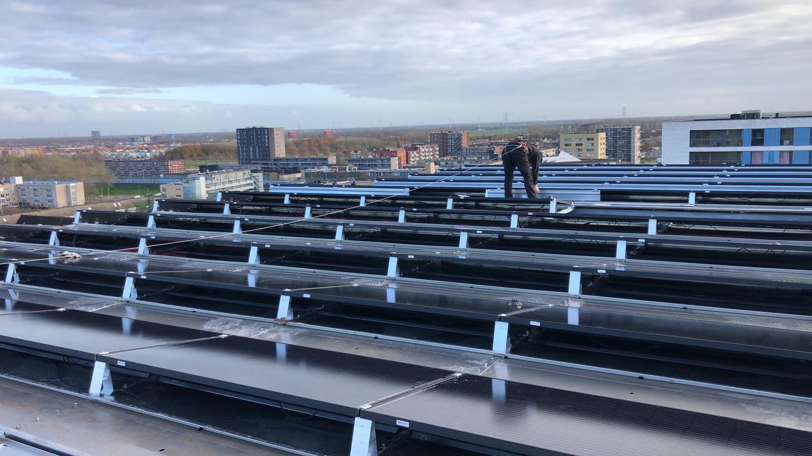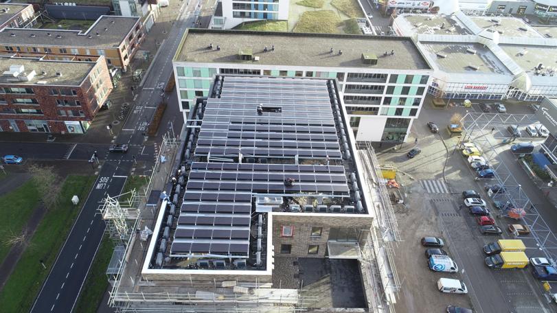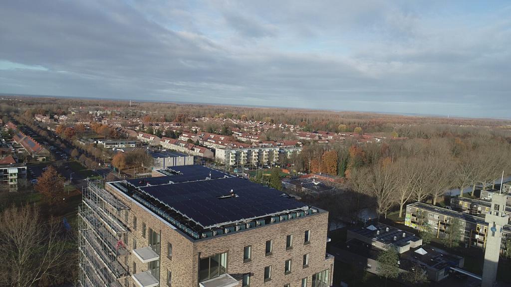 Op de luchtfoto’s is goed te zien dat voor iedere woning een individuele luchtwarmtepomp op het dak staat met daarboven een frame met de zonnepanelen is gemaakt.